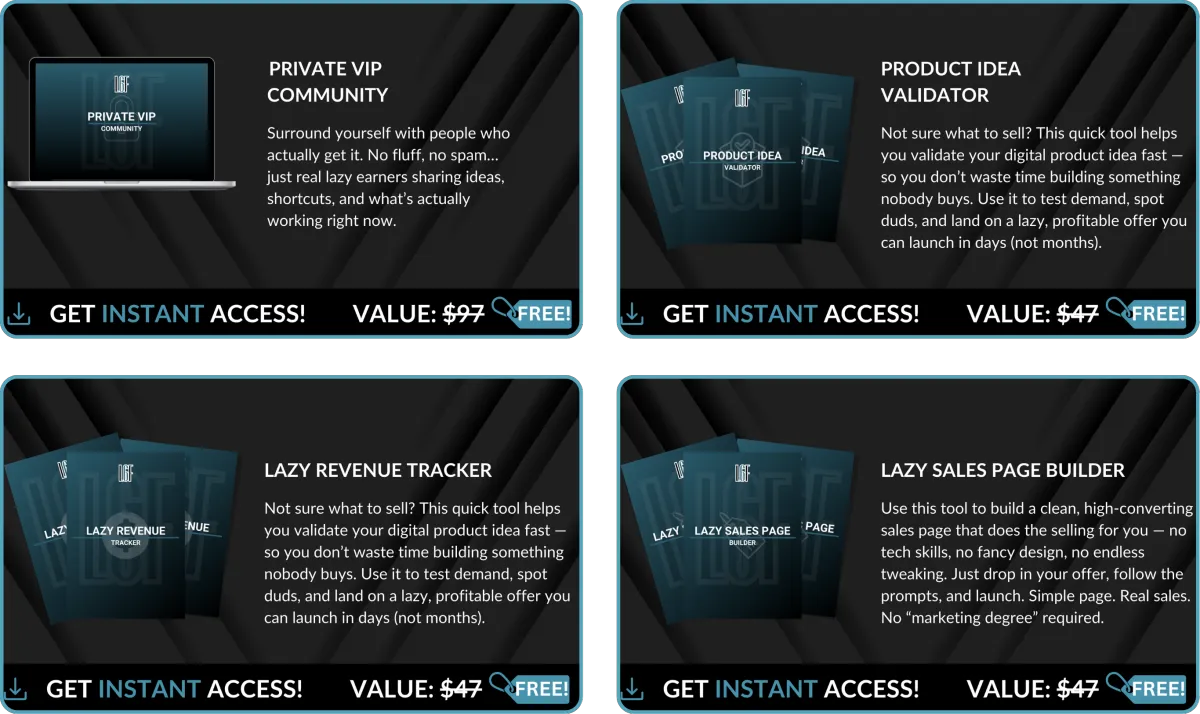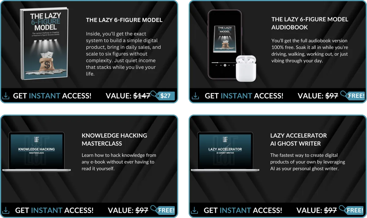 Once you grab your copy of The Lazy 6-Figure Model, you’ll finally be able to stop doing the exhausting, unscalable stuff you’ve been forcing yourself to do just to make a little money online…